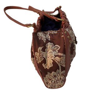 Elegant shoulder bag with floral embroidery. Studded accents. Dual handles for easy carrying.