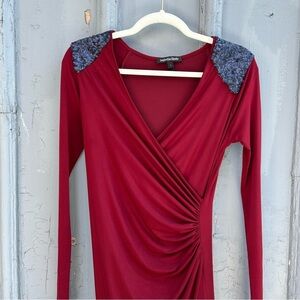 Isabella Oliver Evening Dress. Beautifully figure hugging with ruched sides, deep V neck, long sleeves, and extra long, with the beautiful sequinned shoulder details.