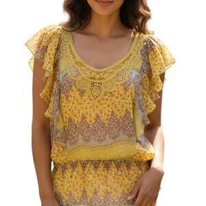 Isabella Rodriguez Yellow Floral Lace Ruffled Short Sleeve Blouse Top Small