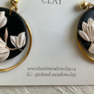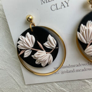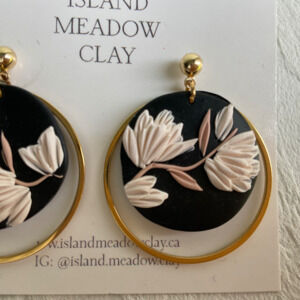 Creamy white 3D flowers have a beautiful soft dusty pink tinge to them; they rest on a black background with gold accents.