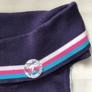Colour block sleeveless sweater. Navy (has pretty purple undertones) baby blue, pink & white bold block stripes. This is a gorgeous statement piece with decorative crystal button on left shoulder. Good quality fabric. Stunning top