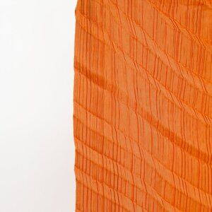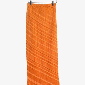 An apricot orange maxi-skirt from Issey Miyake in a diagonally pleated pattern featuring an elastic waistband.