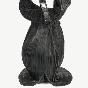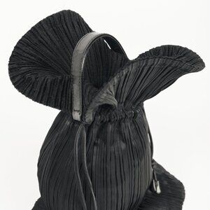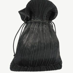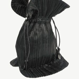 Made in Japan, this evening bag from Issey Miyake is crafted in a black satin pleated all over, and features a drawstring closure with a patent leather handle, a gusseted bottom, and tonal velvet trim on the inner top edge.