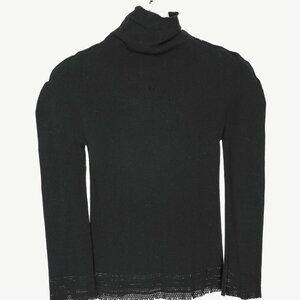 Made in Japan, this pullover from Issey Miyake's Fete line is crafted in a black knit with pointelle detailing on the hems and chest. It features long sleeves, a turtleneck, and raw edge seaming.