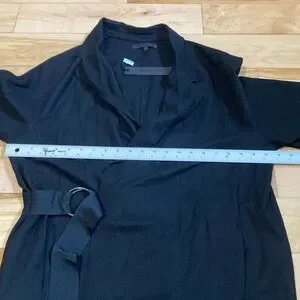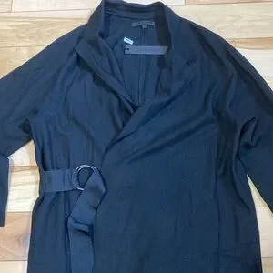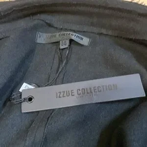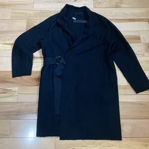 Izzue Collection light weight wool blend trench/kimono style jacket. Super contemporary and stylish raw edge jacket very versatile can be dressed up with a sleek grey outfit or down with a frayed crop faded denim and white t-shirt. Perfect for any occasion. Gorgeous ribbon style closure. New with tags fits more like a m/l see pictures for measurements.