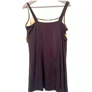 This is in excellent used condition. This it will work for the beach, vacations, and aquasize. Attractive gold and brown pattern around the bodice finished with a chocolate brown skirt.