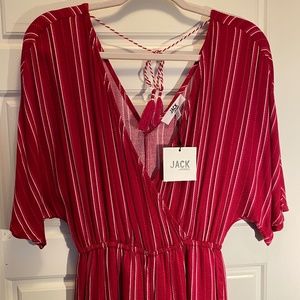 The perfect shade of lipstick in a jumpsuit! The BB Dakota It Takes All Stripes is a stripe printed jumpsuit with a cropped leg silhouette, crossover v-neckline, and a tassel tie back detail.