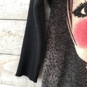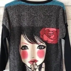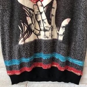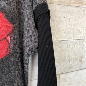Merino wool Graphic Front and Back with crystals on the front flower Length is 33 inches, Pit to pit 21 inches No visible flaws Looks great with tight, leggings, skinny slacks, jeans and high boots