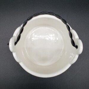 -Beautiful ceramic basket or planter with pretty limp twisted black metal handle adorning bright and colourful pansy flowers