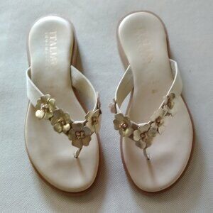 Gorgeous cream colour Italian Shoemaker sandals embellised with Silver-gold metallic flowers with rhinestone centres. Genuine suede straps, synthetic padded footbed, manmade sole. These sandals will complement any outfit from dressy to casual. In great used condition -purchased from The Bay last year and only worn a few times. In addition to stunning designs, Italian Shoemaker shoes are lightweight, comfortable, very well made and durable. I have several pairs that I'm still wearing after more than ten years.