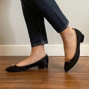 These Italian made pointy flat feature leather soles, 3/4" heel, lace overlay and tan bow / details. Best suited for size 8.