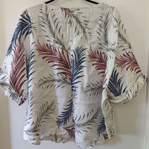 Lovely plus size women's linen t shirt. The label fell off but it's 100% linen, made in Italy. The top has a round scoop neck, cuffed sleeves, and a rounded hem. The linen is soft and drapey. It works well with jeans, casual summer linen pants or dressier pants or skirt.