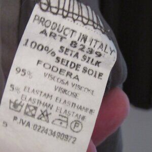 So light and so elegant; this is a 100% Seta Silk Long Tunic designed and stitched in Italy. Seta Reale is a luxurious silk thread for an extra special sewing experience. Trimmings along the neckline and front also done with silk. Features 6 mother of pearl buttons. The colour is dark khaki and it is very difficult to get it right in the pictures. The silk has a lovely delicate sheen to it. Long, wide sleeve with an elastic at the wrist so it's easy to regulate the length. The tunic length from the neck-shoulder down is approx. 83cm. Size larger Medium to small Large. Needs to be seen.