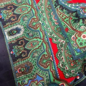A stunning Italian scarf from The Rack Collection, featuring a rich paisley pattern in vibrant shades of red, green, and blue.