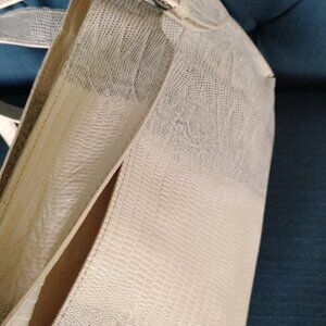 Elegant Genuine Leather Purse made in Italy. Neutral colour cream and light grey embossed reptile print coordinates well with everything. Zipper closure with Buggiani logo pull, double straps with silver colour buckles, and an outside pocket with flap closure. Cream fabric interior with one zipped pocket and one small slip-in pocket. Condition is great - clean with no marks or flaws. Inside is clean with no odours. Bag was stored stuffed and with silica packet to keep it fresh. Straps enable purse to be carried in hand or over shoulder.