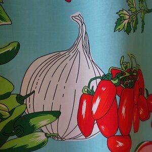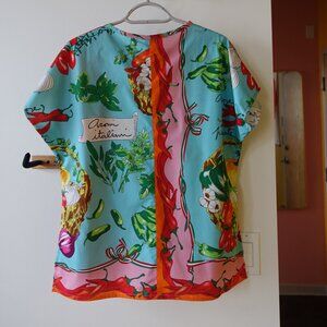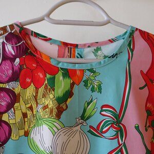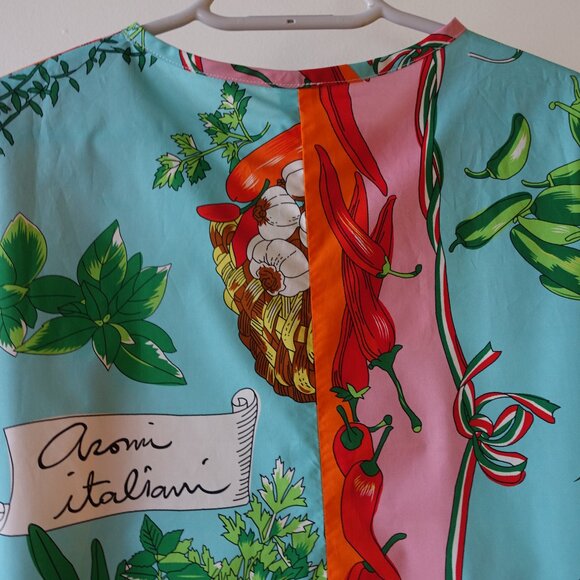 One of kind, unique, homemade top, 100% cotton. Made from a Dolce & Gabbana print cotton fabric. Cute print with italian ingredients: tomatoes, onions, chilis, garlic, parsley and basil. Vibrant colors. Longer back, shorter front. Shirt is a bit long, might be better suited for a tall person.
