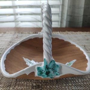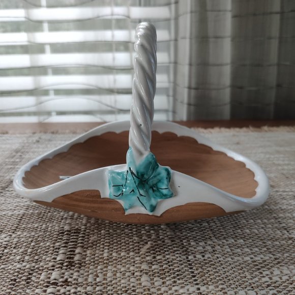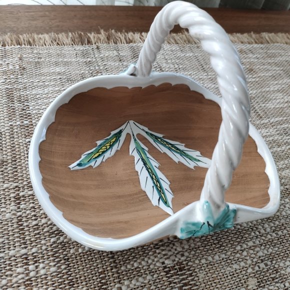 Beautifully Hand Painted Handmade, Made in Italy Terracotta Ceramic Trinket Dish, Cord Rope Handle. Basket Bowl with White Glaze and Brown Faux Wood Finish in Center and Outside, with Glazed Weed Leaf in Center. 5.5 inches in height, 7 inches in length, and 5.5 inches in width . Very Good Vintage Condition no chips, no cracks, no crazing, please see pictures for further details