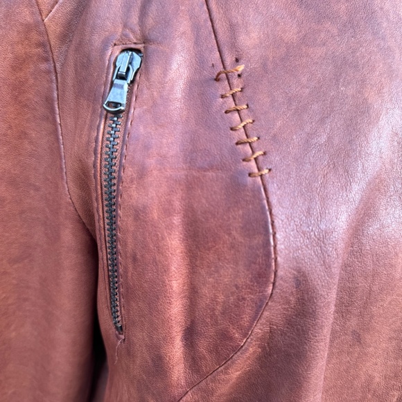 Some areas of minor discoloration, scuffing, and minor white marks, particularly on the sleeves and front. This adds to the authentic, worn-in, vintage character of the leather.
