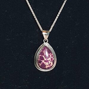 Make a bold and elegant statement with this rare vintage treasure from Italy. This captivating necklace showcases a large, natural purple jasper gemstone with striking cream veining, artfully set in a sleek teardrop-shaped 925 sterling silver bezel. Both the pendant and chain are stamped “Italy F.N.A 925,” affirming their genuine Italian craftsmanship and quality.