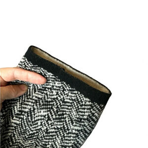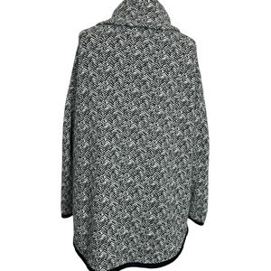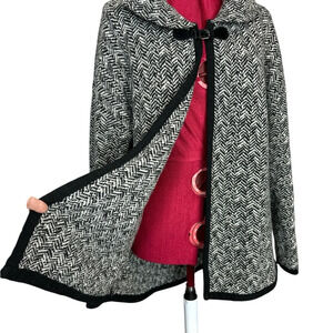 Warm wool sweater with a unique faux suede buckle at the neckline for a closure, pleated round collar for a feminine touch, and a herringbone look knit.
