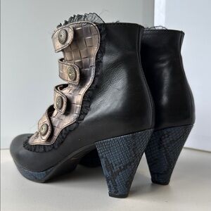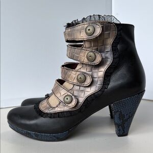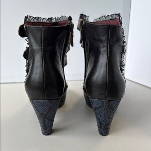 Italmoda Black, Tan, Blue Victorian Heeled Boots with Straps and Lace Trim