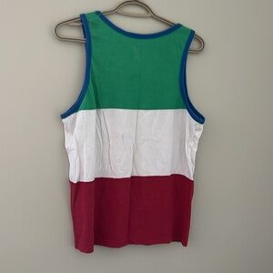 Colorful tank top with Italy flag design. Features green, white, and red stripes with blue lettering. It’s in good condition sized Small. Measurements: