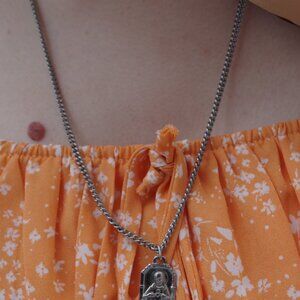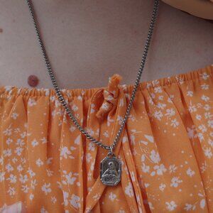 Saint Christopher metal necklace, is a Catholic religious medal depicting St. Christopher, typically shown carrying the Christ child ,and often paired with St Michael Archangel on the reverse. In good condition 21/2 cm 1cm wide. The length is 32cm length,