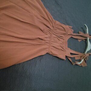 Brown Summer dress, midi length with tie straps, defined bust and body, some stretch at back and waist. Front slit at bottom for movement and comfort.