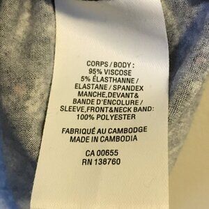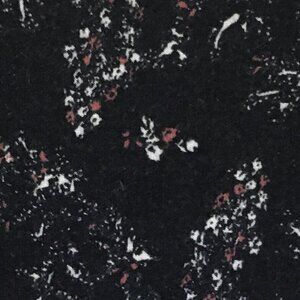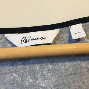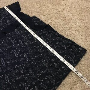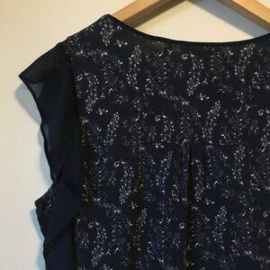 Very good preowned condition, dark navy blue/almost black ruffled shoulder and down the front in chiffon, sleeveless blouse by Reitmans. Features cute a tiny repeating floral print throughout in whites and red. Made of two different fabrics. The main body is a soft natural viscose with some spandex for stretch. There's some light wear from regular washing, but still in good shape and plenty of life left.