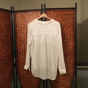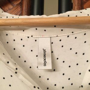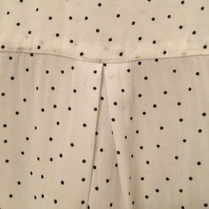 Excellent used condition long white button up blouse with tiny black polka dots by Soyaconcept. Soyaconcept is a popular European label from Denmark that creates elegant, minimalist and sustainable clothing. Cute delicate polka dots and soft, light fabric. Great summer and spring time fashion. I have two of these available. One in medium and this one in large.