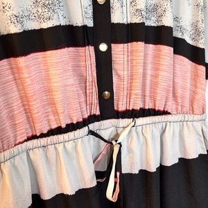 Elegant dress with black and pink stripes. Features button details and a flattering fit. Tie waist and side pockets.