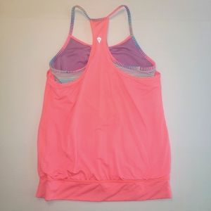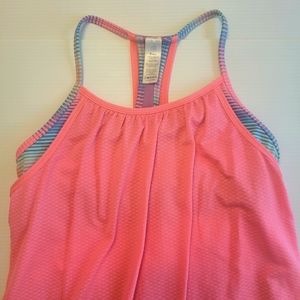 Ivivva Double Dutch tank top - peachy pink flowy outer layer with pink, purple turquoise abstact stripe bra inside.