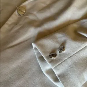 Elegant creamy/ivory blazer with a single button closure. Features a classic lapel and buttoned cuffs. Minimal pilling.