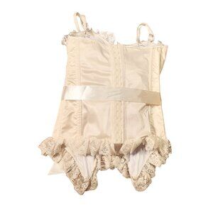 Ideal for brides or vintage theme, this elegant ivory bustier adds a romantic touch to your special day. Crafted with structured satin and supportive underwire cups, it features delicate lace, a pearl-accented bow, and a soft ruffled hem. The removable straps and garters let you style it exactly how you like. A beautifully shaped, classic vintage or bridal piece that works perfectly under a gown or on its own.