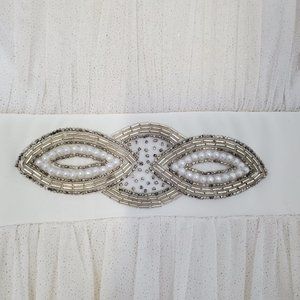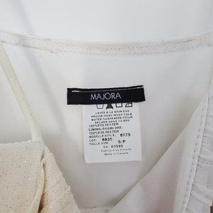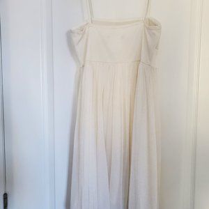 White empire-waist cocktail dress with gold-flecked gauzy overlay. Art deco-style embellishment under the bust has faux crystals, pearls, and beads. Bust is lightly padded and has a bit of stretch at the sides. I had the straps shortened, but they can be let back down.