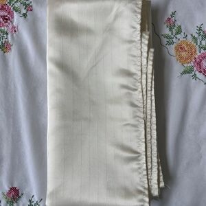 Beautiful, shiny polyester tablecloth that measures 60"x98". Stripes are subtle and alternate thread direction. Clean and stain free. Washable and from a smoke free home.