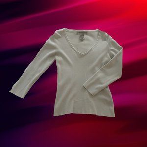 So cute, size small, white womens 3/4 length sleeve shirt, gentle v neck, thick rayon knit. 65% rayon 35% nylon