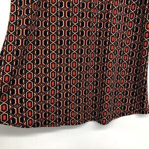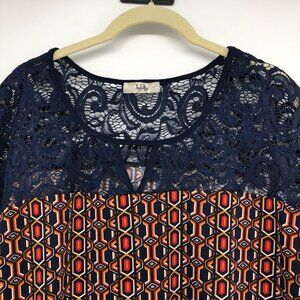 This top has a navy lace upper part, the rest has some retro 70s geometric patterns. Short sleeve / slit sleeve, round neck with a keyhole or cutout in the front.