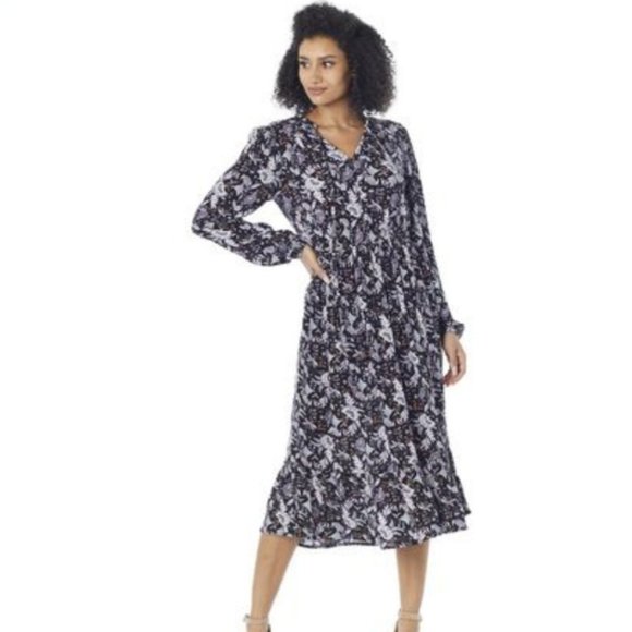Long sleeve midi dress with cinched elastic waist, subtle ruffle neckline with tie.
