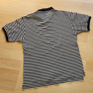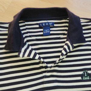 “Classic Izod polo with black and white stripes. Short sleeves. Comfortable fit.”