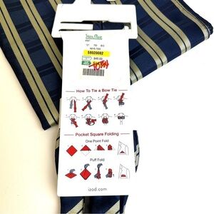 Unused bow tie, and matching pocket square (that may have been used as it is out of the packaging). Blue and gold stripes. In very good condition!