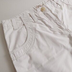 Low rise capris in a neutral light beige colour. Made from comfy breathable cotton. They have a zip button closure and belt loops so you can easily accessorize with your favorite belts. Comes with two front and back pockets and there's a string tie on the leg hem to secure the fit during all your active adventures. Perfect for summer. Great condition.