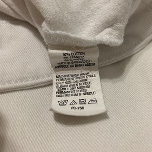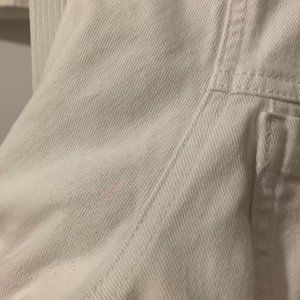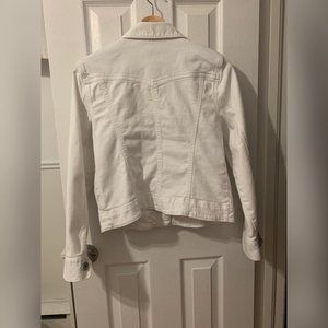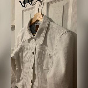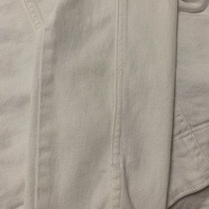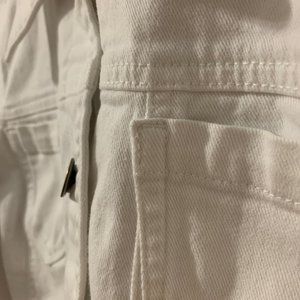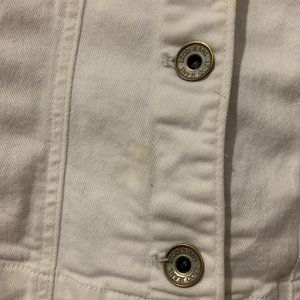 A white button-down denim jacket with button closure on cuffs. Two pockets at front. **Notice** There are some less noticeable stains.