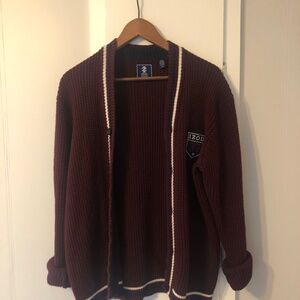 This is a men’s cardigan but I bought it because I liked the color and nerdy vibe. It definitely has a dark academia look. The cardigan is large and fits loose on my size 8 frame. The sleeves need to be rolled. The color is a gorgeous burgundy and the material it’s a soft but structured knit with a fun textured pattern.
