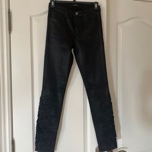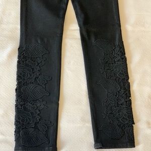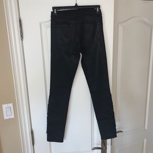 Details: Extremely well fitting jeans. Lots of stretch. Coated for a dressier/evening look. The lace at the bottom gives them an extra bit of edge and class.