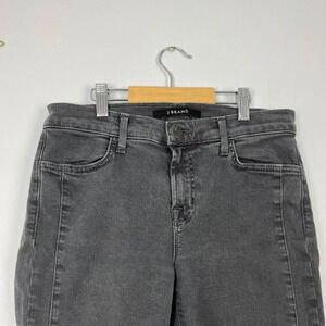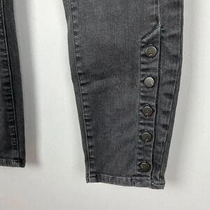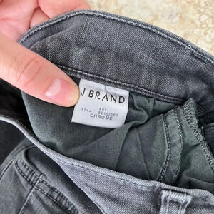 These J Brand jeans feature a stylish faded grey wash with unique button detailing at the ankle for an edgy finish. Crafted from a comfortable stretch blend, they offer a flattering skinny silhouette with a mid-rise waist. In good used condition—perfect for pairing with everything from sneakers to heels.