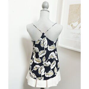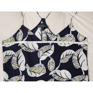 Navy blue bold white & yellow leaf pattern spaghetti strap tank top with a V neck front. Flowy loose drape.