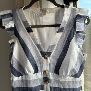 J.Crew Point Sur blue striped cotton-linen midi dress. Size 4. Gently worn and in excellent condition. Perfect for summer or upcoming vacations. Button-front in a lightweight linen fabric, feminine ruffle cap sleeves & pockets! From a smoke free / pet free home.
