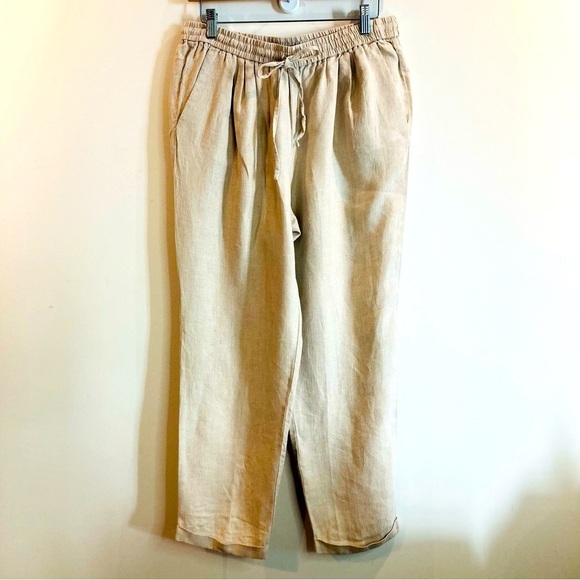 J CREW Sz 10 100% Linen Elastic Band Drawstring Waist Pockets Tapered Leg Pants. Super breeze. Light weight. Dress up or down.