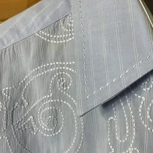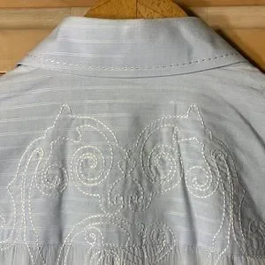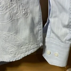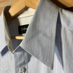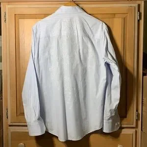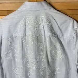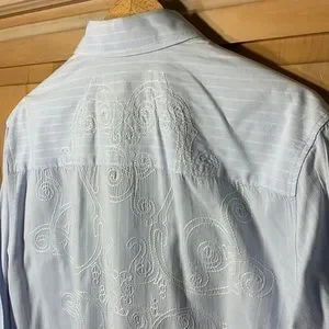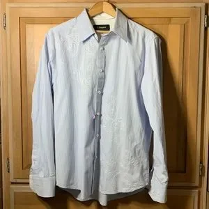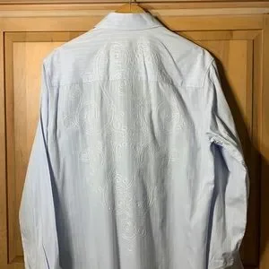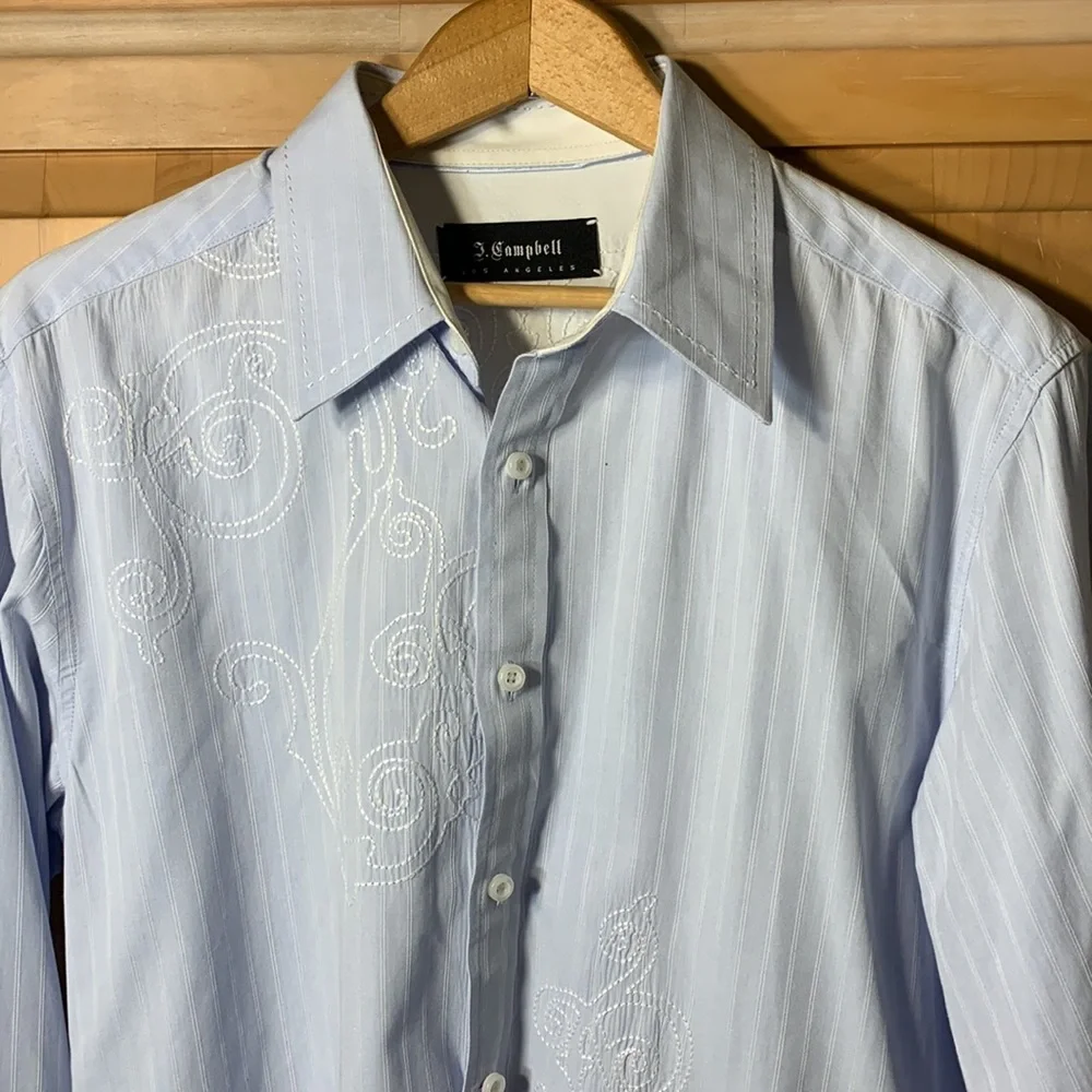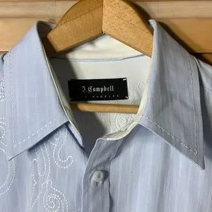 Such a great shirt. J Campbell out of LA make such great items. This shirt is in excellent condition just like all items that I have for sale in my closet. The stitching is on point, and the embroidery just absolutely sings. The flared collar harkens back to the 70s but the cut and tailoring is as contemporary as it gets. No stains, no fading, no rips or tears or loose threads. Immaculate and ready for a night of clubbing and cocktails.